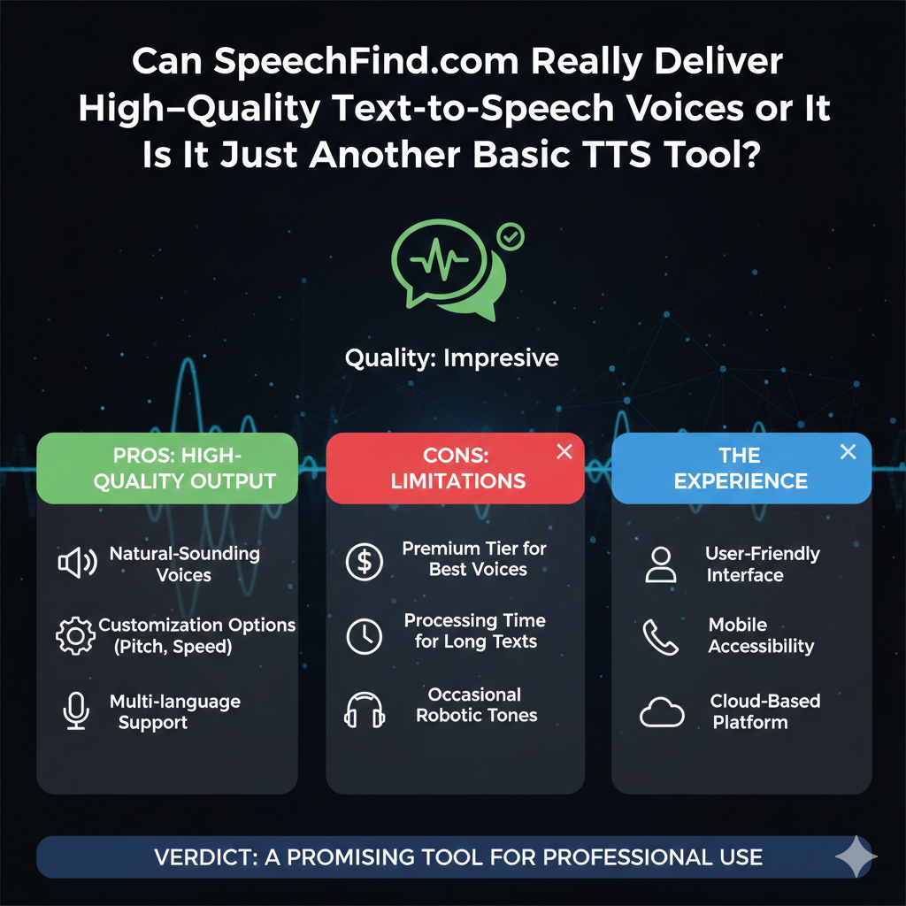 Unlike well‑established services such as Google Text‑to‑Speech, Amazon Polly, or Microsoft Azure TTS, SpeechFind.com has limited independent credibility data available from third‑party review platforms. This means users should be cautious and verify output quality before using it for professional or commercial projects.